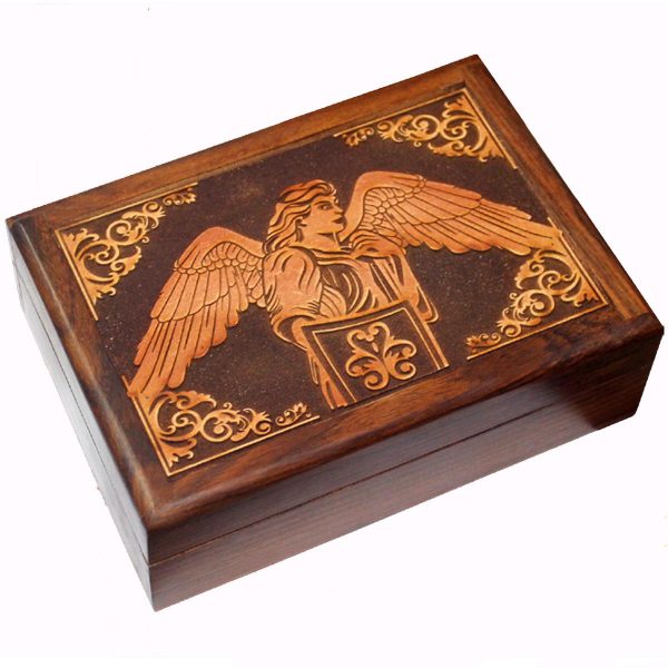 Smooth polished sides and a deep rich tone complete the laser cut design box with a metal charm to finish this wooden box. Use this velvet lined box for storing jewelry, precious stones, crystals or tarot cards. The Box is 12.75 x 17.75cm.