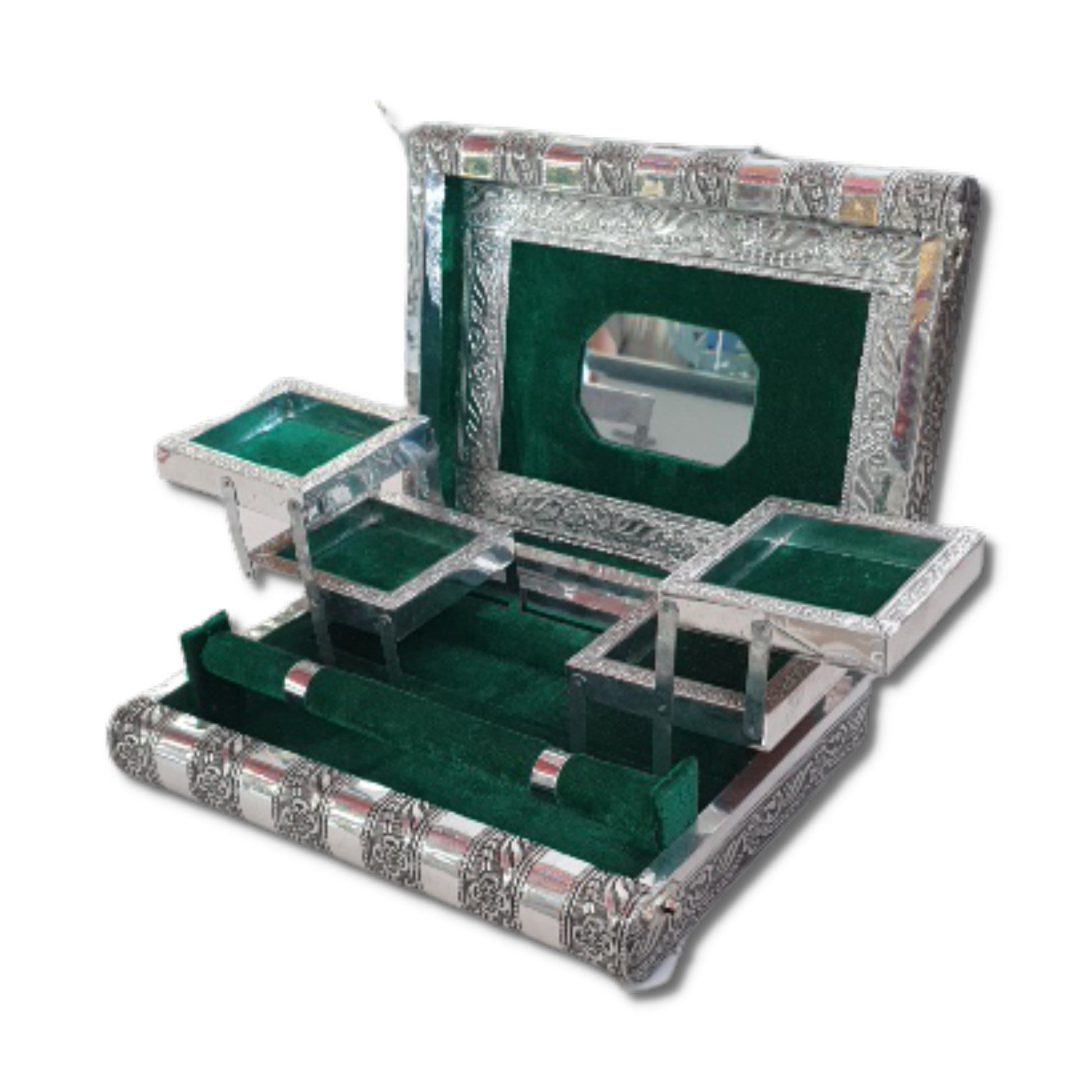 Inlayed with dark green velvet. Drawers pull upwards to reveal more jewellery storage, and a roll to hang bracelets & earrings on.